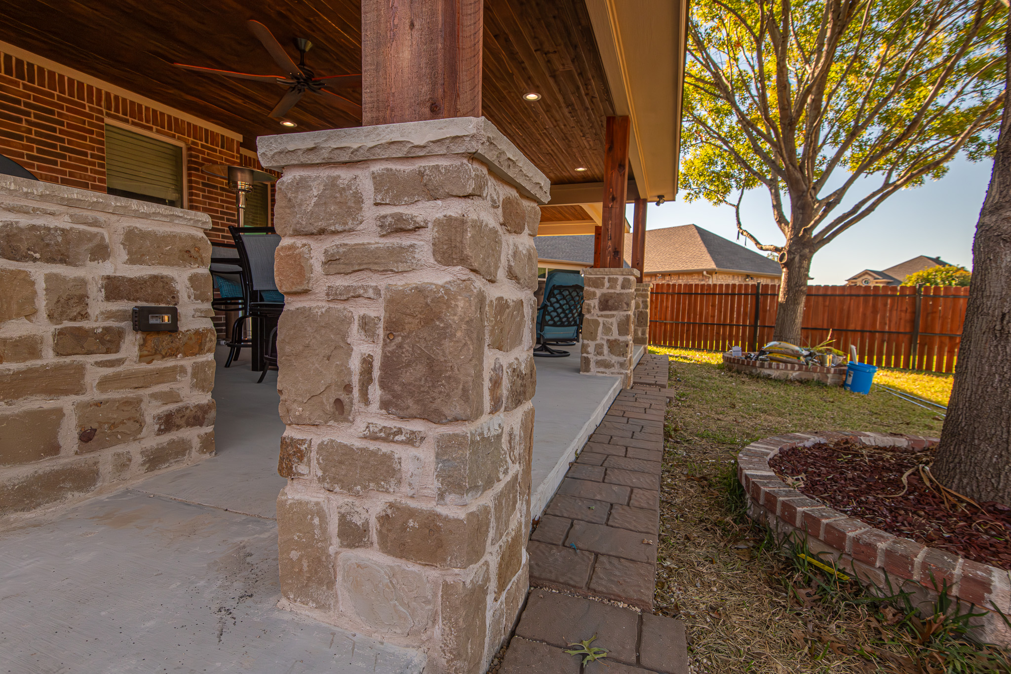 This custom covered patio has some great upgrades. Outdoor kitchen, with sink and refrigerator, stone footers, TV Wall, lighting, fans, and endless room to hang out.
