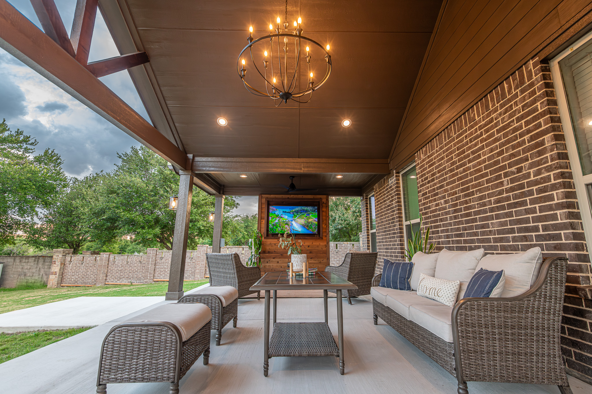 How beautiful is this grand, gable covered patio? Complete with an outdoor kitchen, custom TV wall, and plenty of seating, this family will be making backyard memories for years to come. Like something you see? Reach out so we can help you design your own dream space.