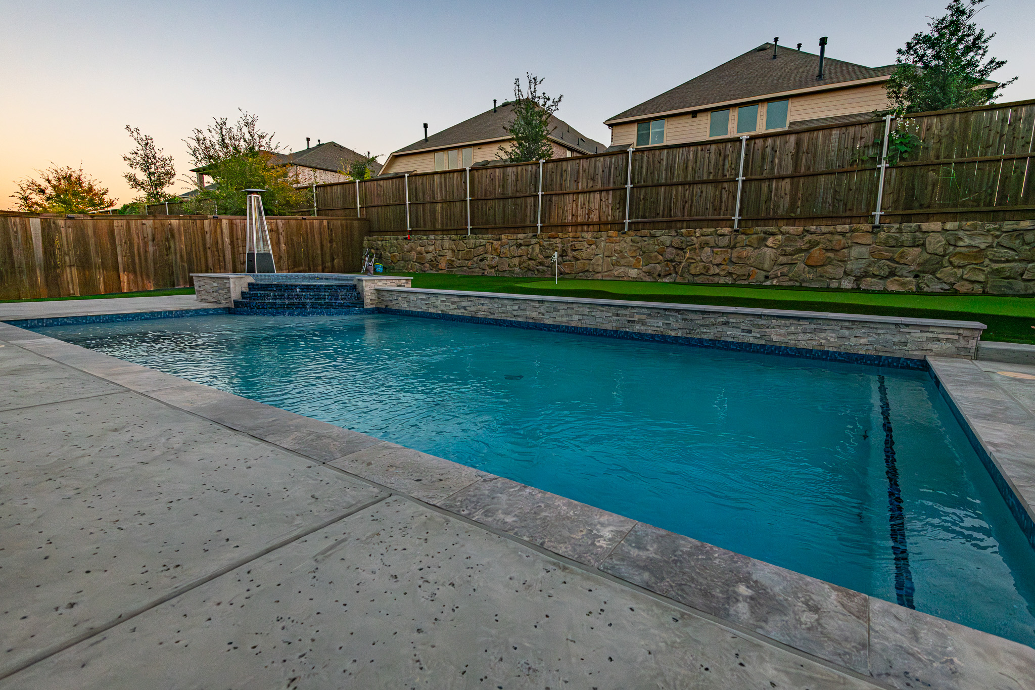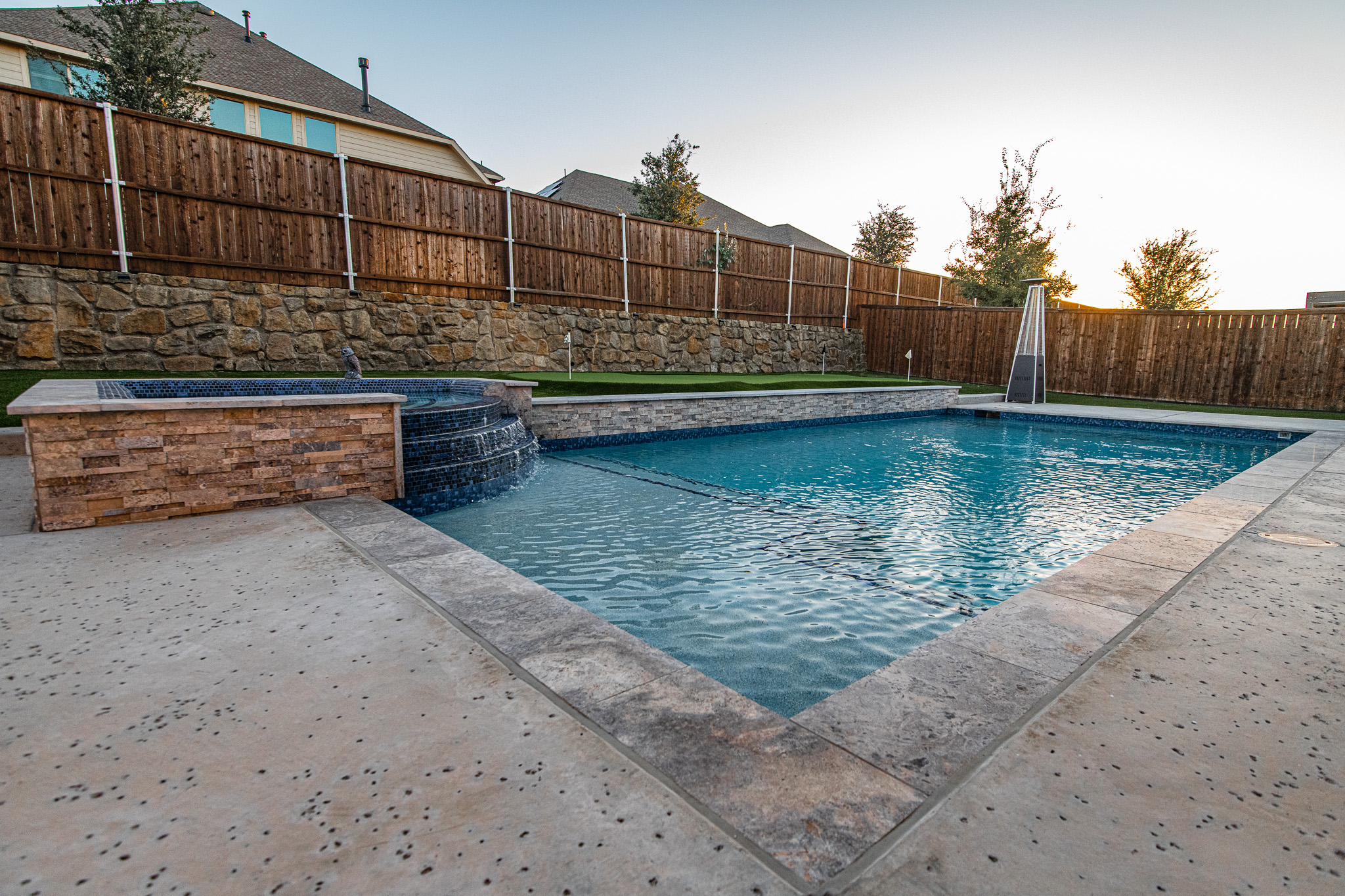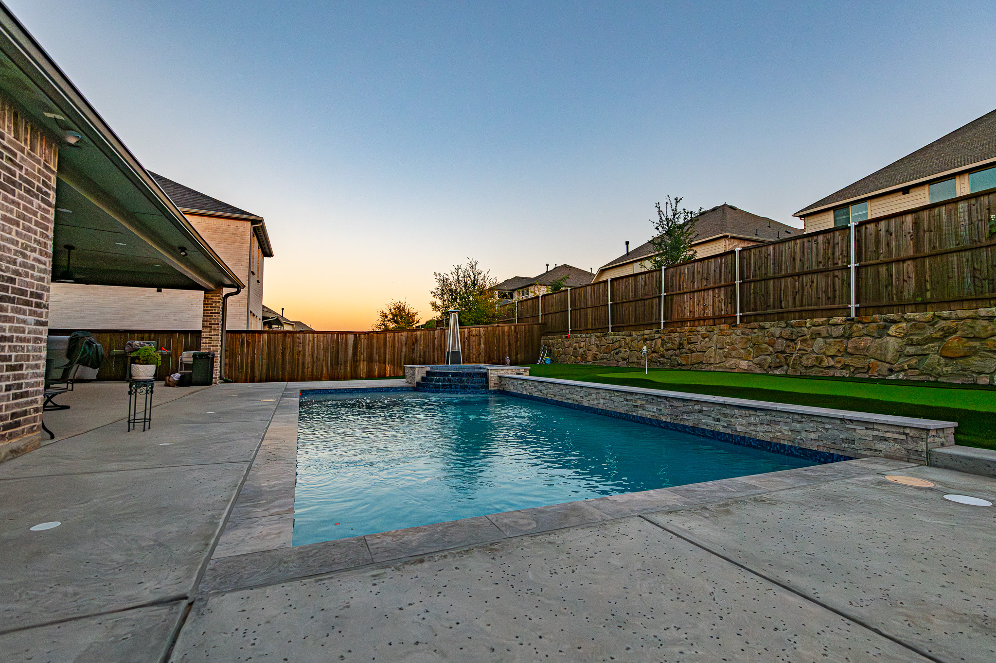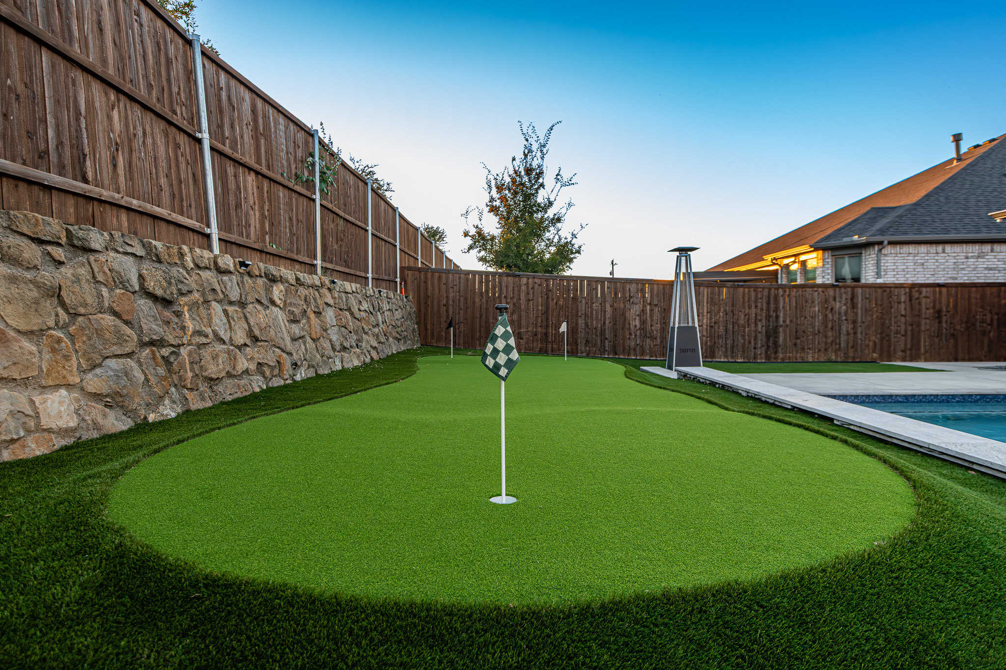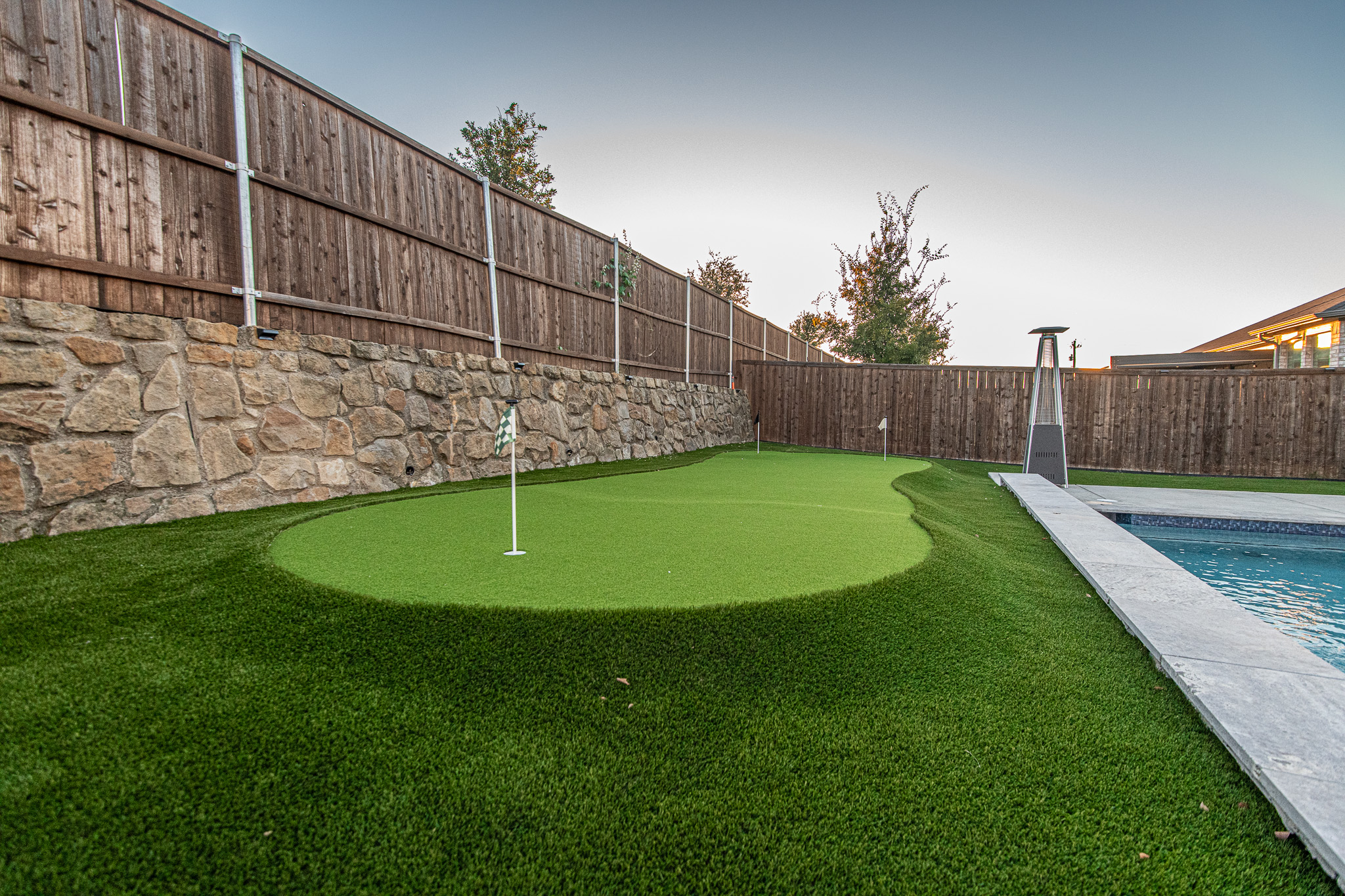 Explore our latest outdoor living project in Haslet, Texas, featuring a luxurious custom swimming poollow-maintenance artificial turf, and a professional-grade putting green.