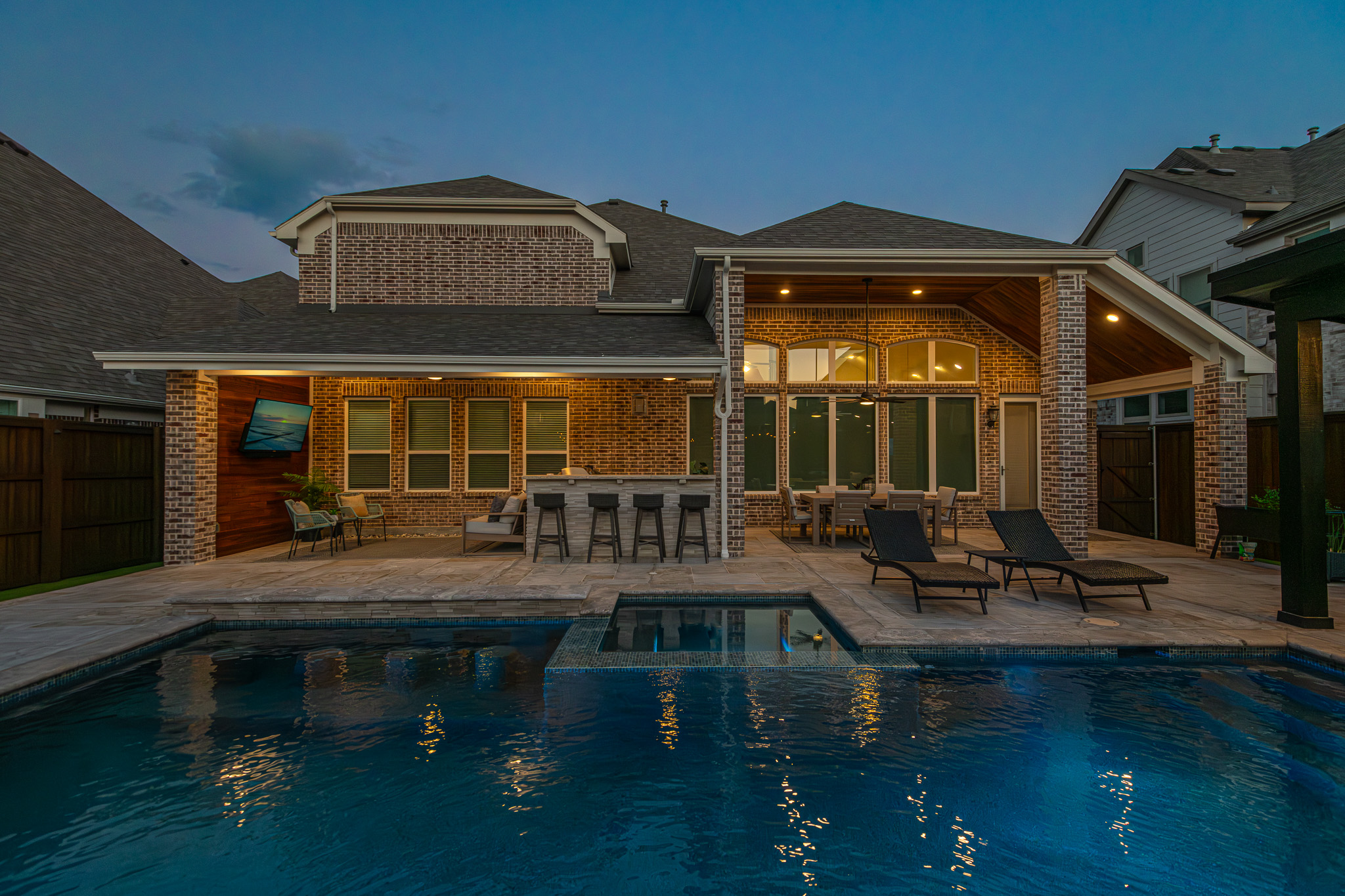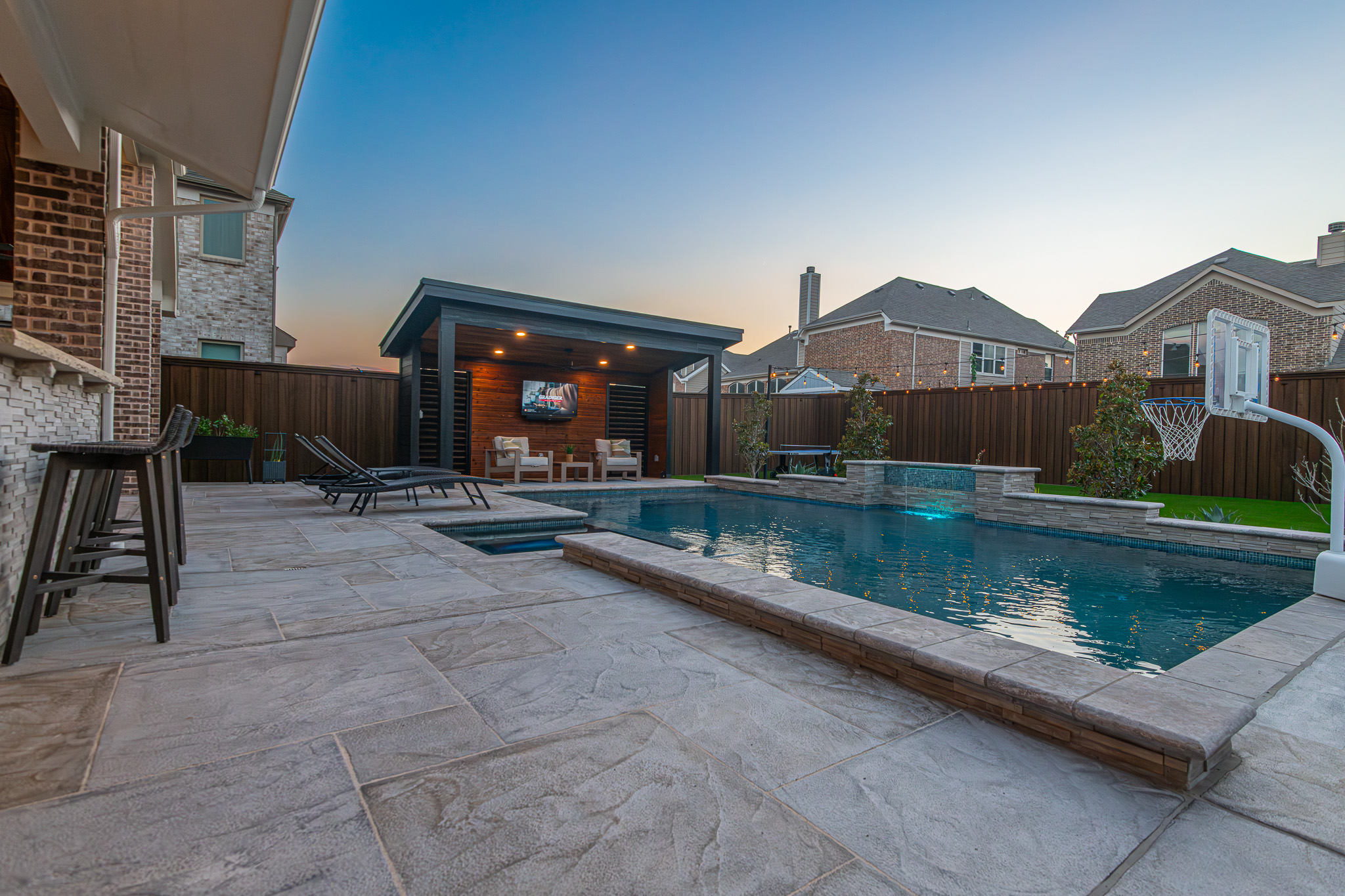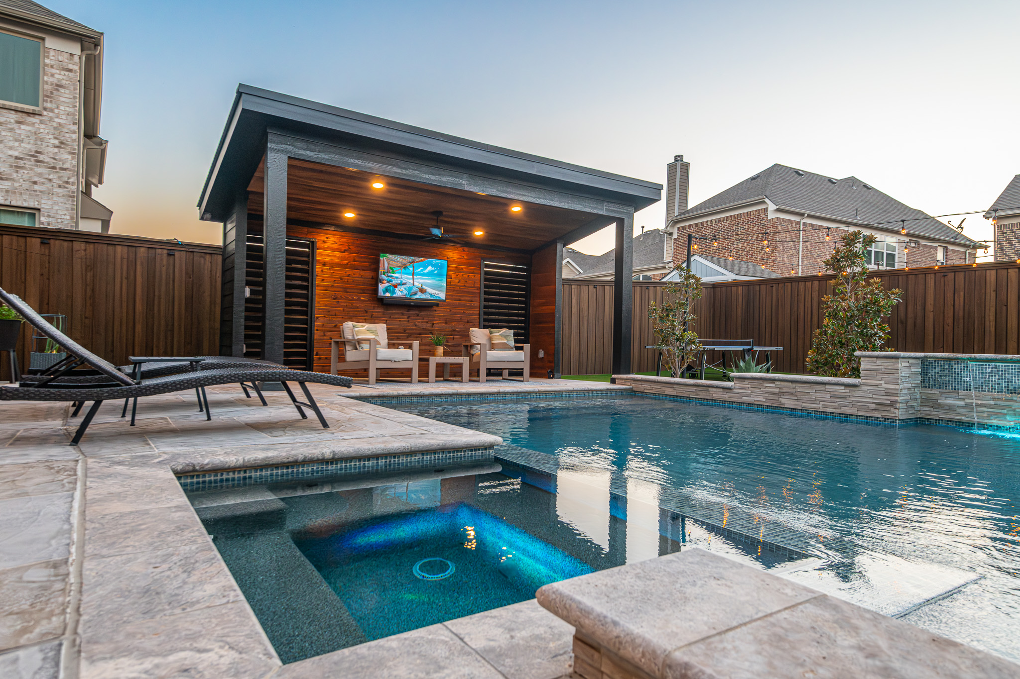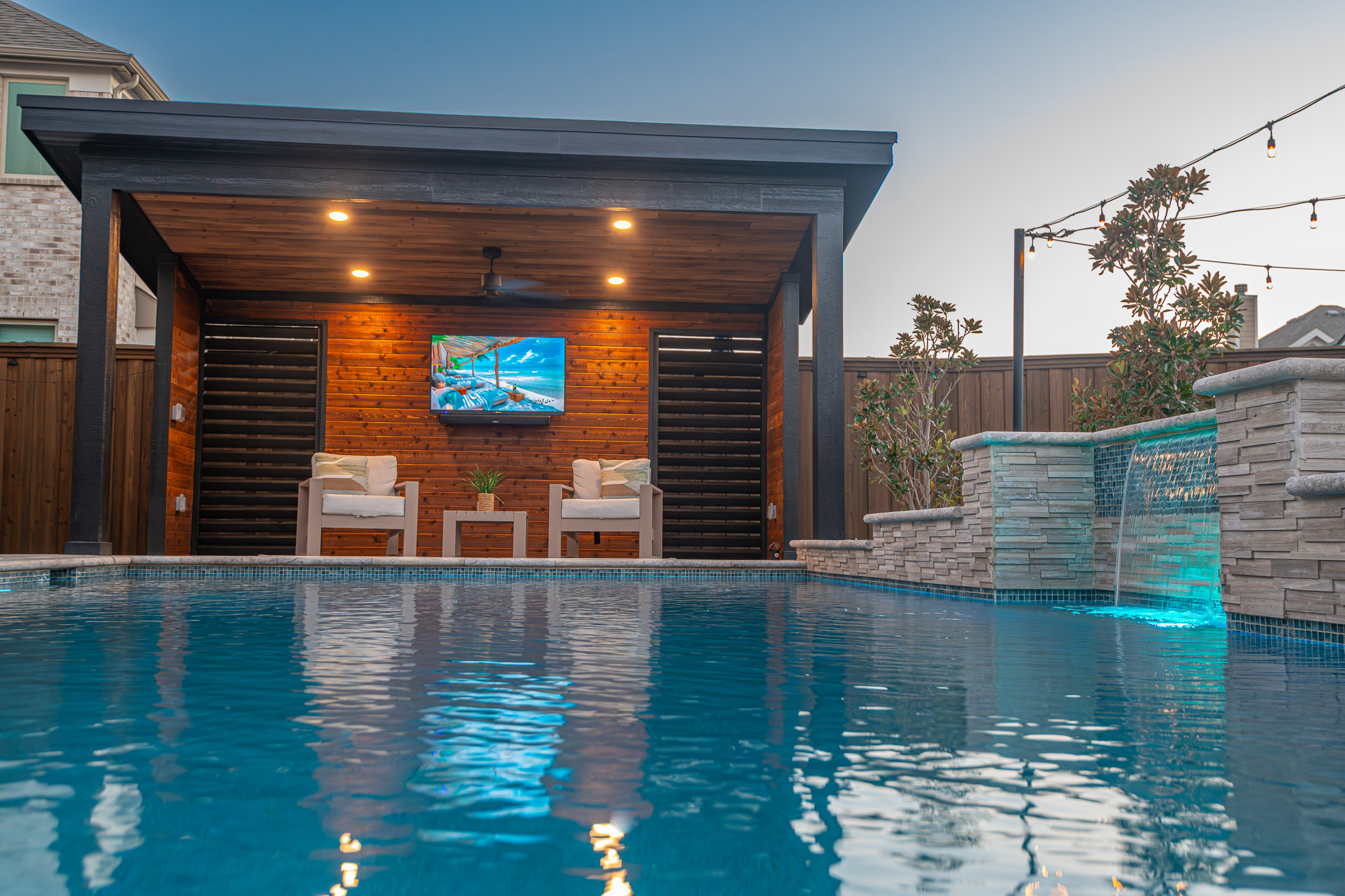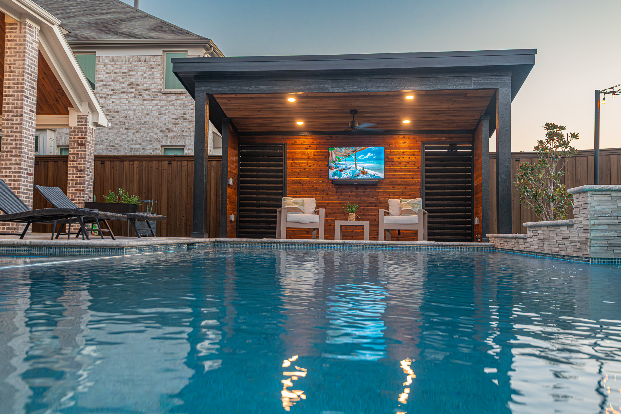 Tanning and lounging in the sun is great, but every Texas knows it can become too intense. We created a custom shade structure at the end of the pool, also complete with a TV to enjoy while swimming.