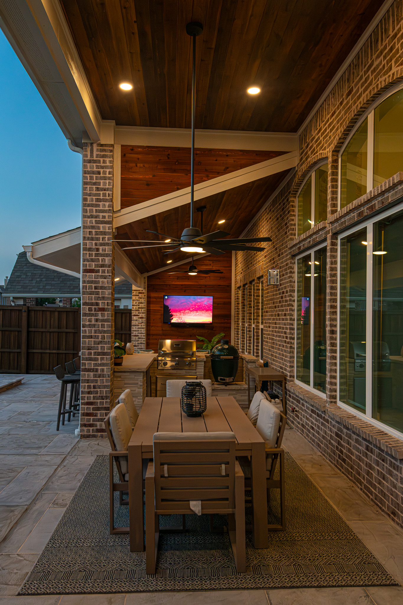 This family wanted to enjoy an outdoor kitchen as well as a comfortable sitting area, complete with a TV. The structure was integrated to the home for a seamless look.